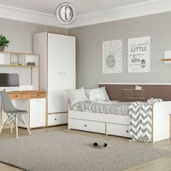 Светлая и аккуратная молодёжная мебель. Основой модульной системы является кровать-трансформер. Её столешница имеет постоянный горизонт, то есть при трансформации не нужно убирать вещи. Система хранения с подъёмными фасадами значительно расширяет функционал. Также имеются письменный стол с надстройкой и полкой, шкафная группа и комод с тумбочкой. Вместе они позволяют создавать разноразмерные композиции.