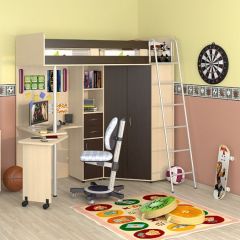 Кровать-чердак "Теремок-М85" - это целый комплекс мебели, включающий в себя спальное место размером 200*80 см, шкаф для одежды, пенал с ящиками и полноценный рабочий стол. Прочная конструкция рассчитана на детей до 16 лет. Такой уголок экономит пространство в детской комнате, при этом обеспечивая все необходимые функции.